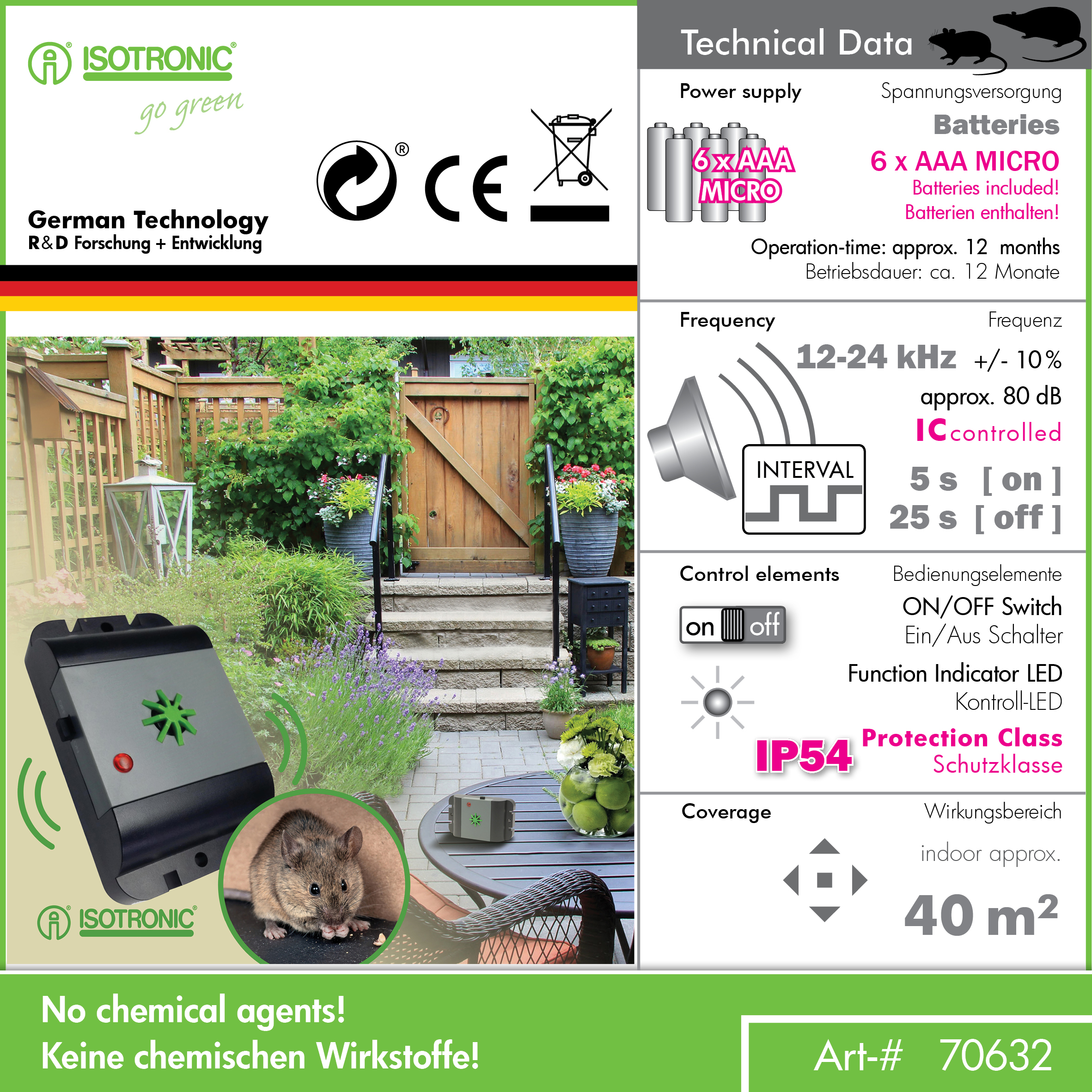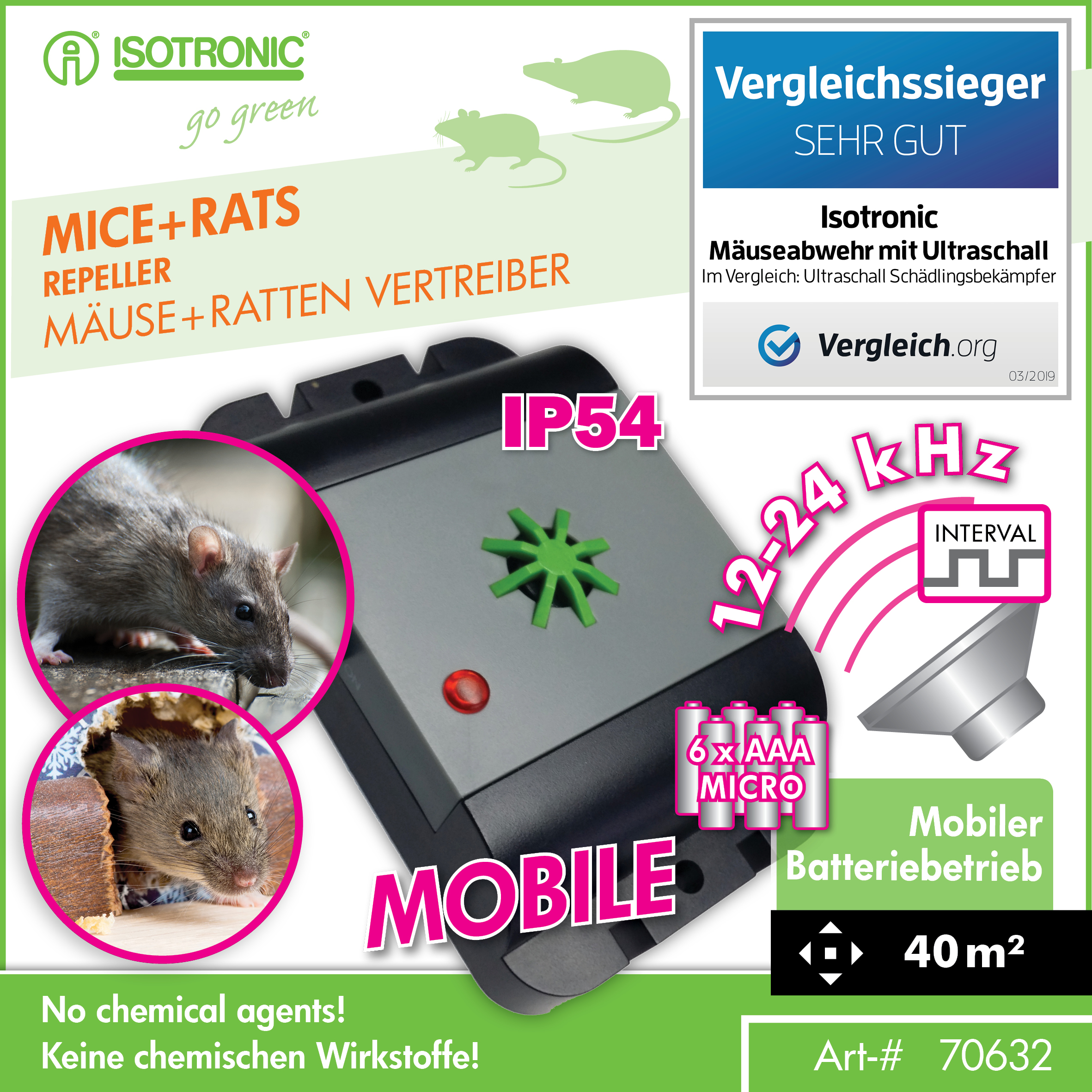 ISOTRONIC plašič myší a hlodavcov odpudzuje škodcov pomocou ultrazvukových signálov, ktoré narúšajú ich prirodzené správanie. Tento mobilný odpudzovač funguje na batérie (6× AAA, nie sú súčasťou balenia), takže ho môžete umiestniť kdekoľvek bez potreby elektrického pripojenia. Má dosah 40 m² a je ideálny na použitie v domácnostiach, garážach, pivniciach, skladoch, podkroviach či potravinárskych prevádzkach.
