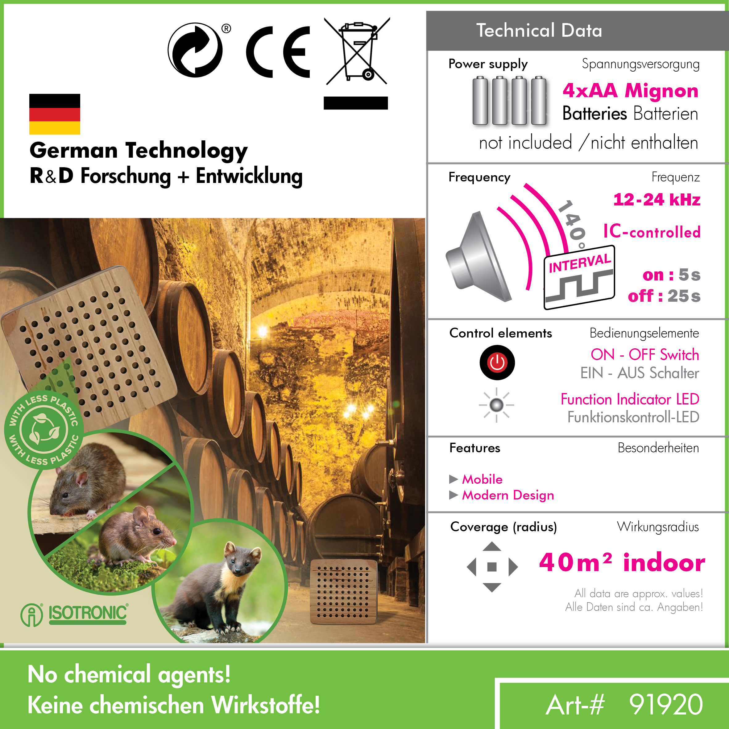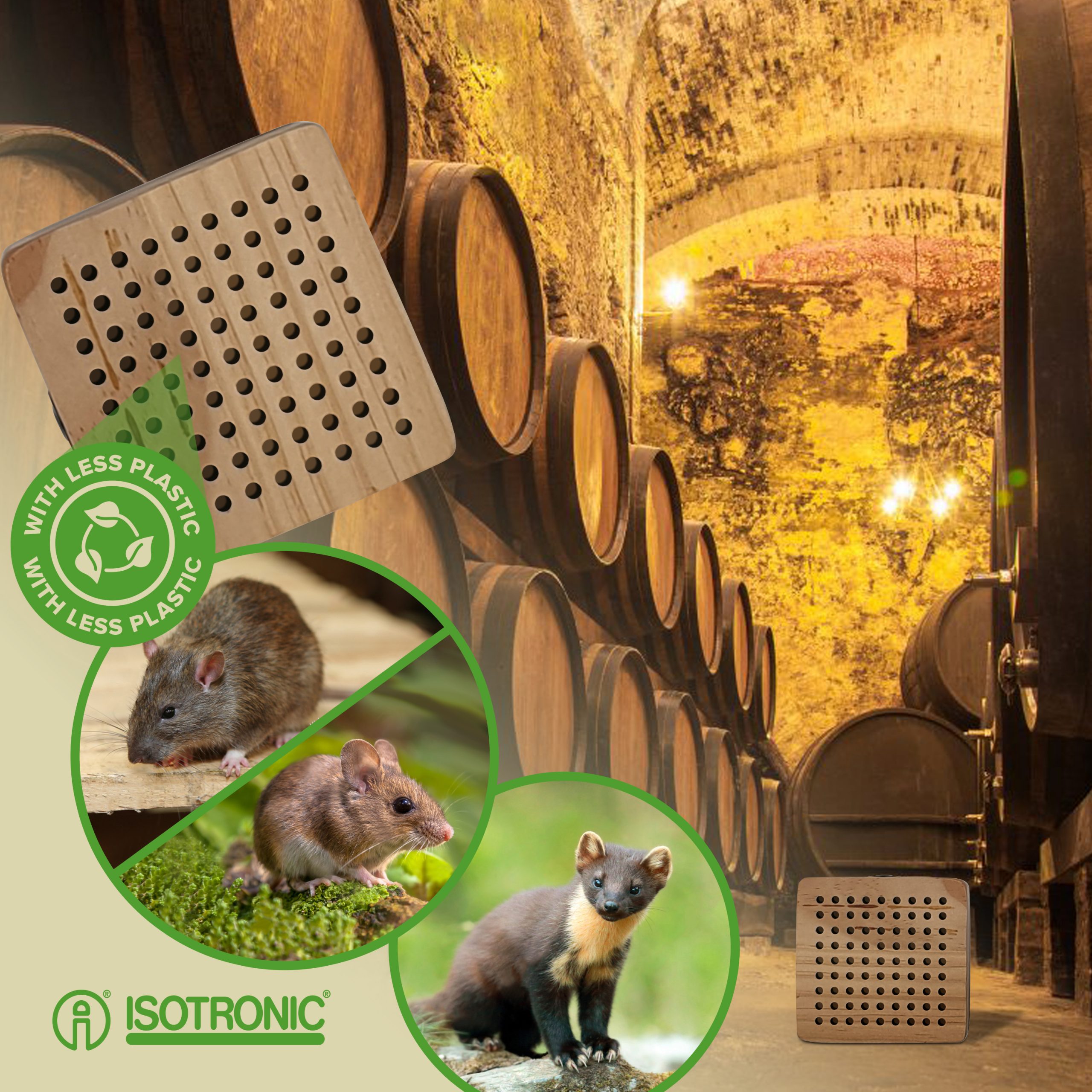 Kryt inovatívneho mobilného odpudzovača zvierat od spoločnosti ISOTRONIC je vyrobený z dreva, je napájaný z batérie a je možné ho mobilne používať. V budúcnosti sa už nemusíte obávať nechcených návštev hlodavcov vo vašom okolí. ISOTRONIC „Woody“ Mobil vďaka ultrafialovým tónom udržuje škodcov v dostatočnej vzdialenosti od automobilu, domu, garáže, stodoly, podkrovia alebo záhrady. Integrované prepínanie intervalov na 30 sekúnd zabráni