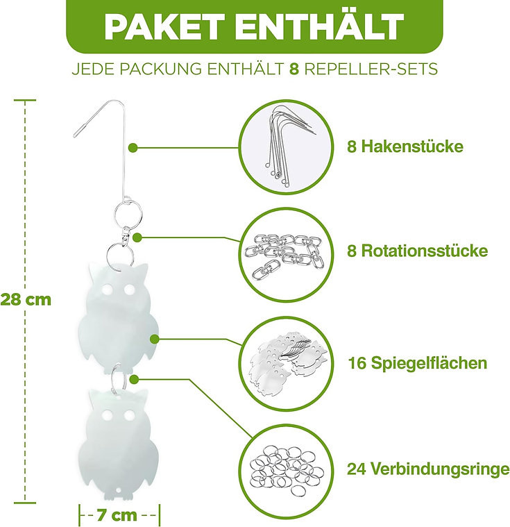 Okrem svojej vysokej účinnosti sa odpudzovač vyznačuje aj jednoduchou inštaláciou. Reťazová konštrukcia umožňuje ľahké upevnenie na rôzne miesta, ako sú stromy, pergoly, balkóny či okraje striech. Keďže kotúče vo vetre prirodzene kmitajú, ich účinnosť sa ešte viac zvyšuje. Navyše, vďaka odolným materiálom zostáva funkčný aj v náročných poveternostných podmienkach.
