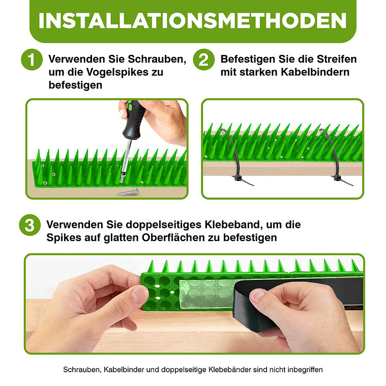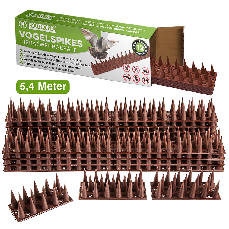 Inštalácia je rýchla a jednoduchá. Hroty sa predávajú v moduloch s dĺžkou 43 cm a balenie obsahuje 12 kusov, čo umožňuje pokrytie plochy 5,4 metra. Stačí ich upevniť pomocou lepidla alebo skrutiek na parapety, rímsy, strechy, klimatizačné jednotky či iné povrchy. Pri montáži je dôležité ponechať jednotlivé moduly bez medzier, aby sa zabránilo vtákom v pristátí.
