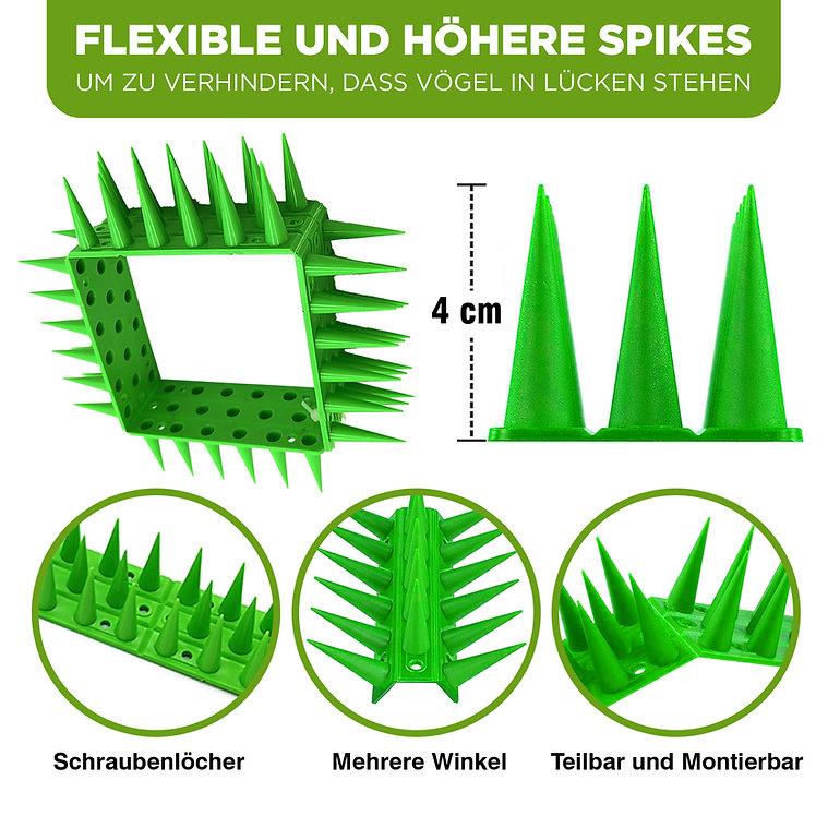 Vyrobené z odolného polykarbonátu, hroty odolávajú UV žiareniu, dažďu, vetru aj mrazu, vďaka čomu poskytujú celoročnú ochranu. Ich výška 35 mm efektívne znemožňuje vtákom sadanie na chránené miesta bez toho, aby im spôsobovali zranenia. Táto humánna a ekologická metóda nevyužíva žiadne chemikálie ani pasce.